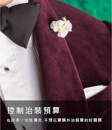 我們準備款式充足的各式西裝禮服讓您租借使用,只需訂製禮服的部分費用,輕易解決您的治裝問題。